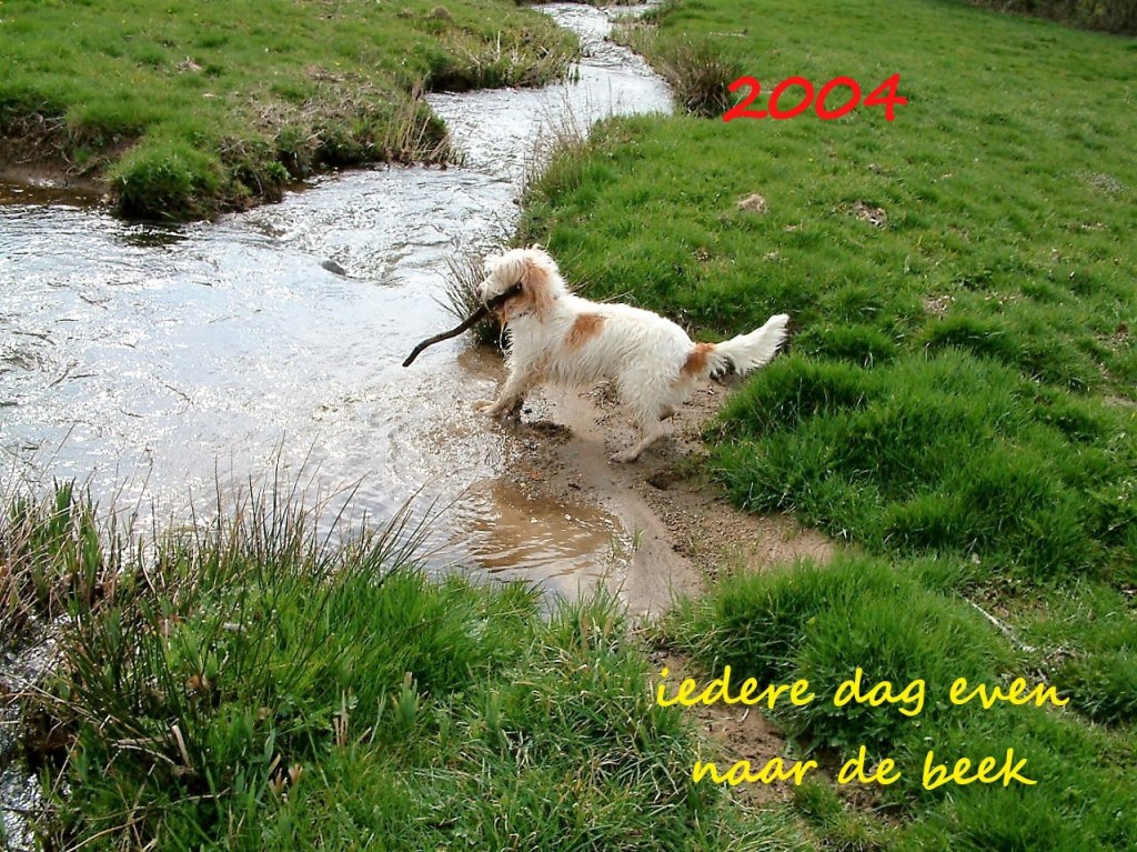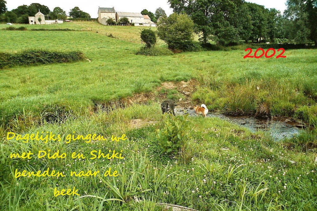 De volgende fotoreeksen bevatten foto’s van ons terrein om het huis. Terrein dat echt bij het huis hoorde en de weilanden en het dal waar wij op uitkeken, een prachtig uitzicht! Als wij door de wei naast ons huis het dal in liepen kwamen wij uit bij een prachtig kabbelend beekje. Bijna dagelijks ging ik daar met de honden naartoe en dat was een héérlijk wandelingetje. Wij hadden de jaren in Vareille 5 opeenvolgende honden. De twee eerste twee waren onze kruising labrador Dido, die helemaal verzot was op water en dus na een bezoek aan het beekje moeilijk weer te bewegen was om mee naar boven te gaan. Samen met Dido ging Shiki mee, een sheba inu, die helemaal niet van water hield, maar toch graag meeging naar het weiland beneden en dan snel met opgetrokken pootjes het beekje overstak. Dido overleed eind 2002 en wij schaften toen in het voorjaar van 2003 een kleine pup aan. Het ras was Grand Basset Griffon Vendeën. Soleil hadden we haar genoemd en zij is tot het jaar 2012 met ons meegegaan naar Vareille. Toen Shiki al behoorlijk oud was, namen wij een Grieks hondje, Luna noemden wij haar. In 2004 werden in Athene de Olympische zomerspelen gehouden en alle zwerfhonden moesten toen de straat af. Via een organisatie hebben wij toen zo’n Griekse zwerfhond uitgezocht en dat was Luna. Een bijzonder hondje, die uiteraard niet erg geleerd had om erg aanhankelijk naar mensen te zijn, maar die toch wel blijk gaf het fijn bij ons te vinden. Soleil en Luna zijn lang samen geweest. Het jaar nadat wij het huis verkocht hadden namen wij Spaans zwerfhondje Marre in huis. Die is in 2013 één keer meegeweest naar Vareille omdat wij toen bij Saskia en Paul, die bij ons in de buurt woonden een weekje een caravan gehuurd hadden en natuurlijk zijn wij toen ook nog in Vareille en in het dal bij het beekje gaan kijken.