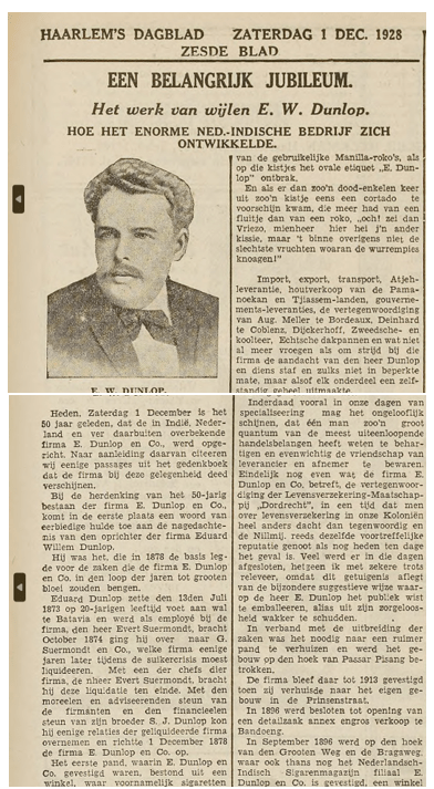 Zijn oudere broer Samuel Johannes had zich daar al gevestigd en liet hem overkomen. Na diverse werkzaamheden begon hij in 1878 met de handelsfirma E, Dunlop & Co. Toen hij 38 jaar was overleed hij heel plotseling aan een hartaanval. Zijn vrouw, Anna Maria Mikkers vertrok daarna met haar drie jonge zonen naar Nederland, waar ze opgevoed werden en hun opleidingen kregen. Oudste zoon Eduard Willem ging op 21 jarige leeftijd weer terug naar Indië, waar hij in 1910, hij was toen rond de 30 jaar, mede firmant van Dunlop & Co werd. Hij was toen al enige jaren getrouwd met Helena Carolina Buurman van Vreeden. Eduard en Helena waren mijn grootouders, de ouders van mijn vader.