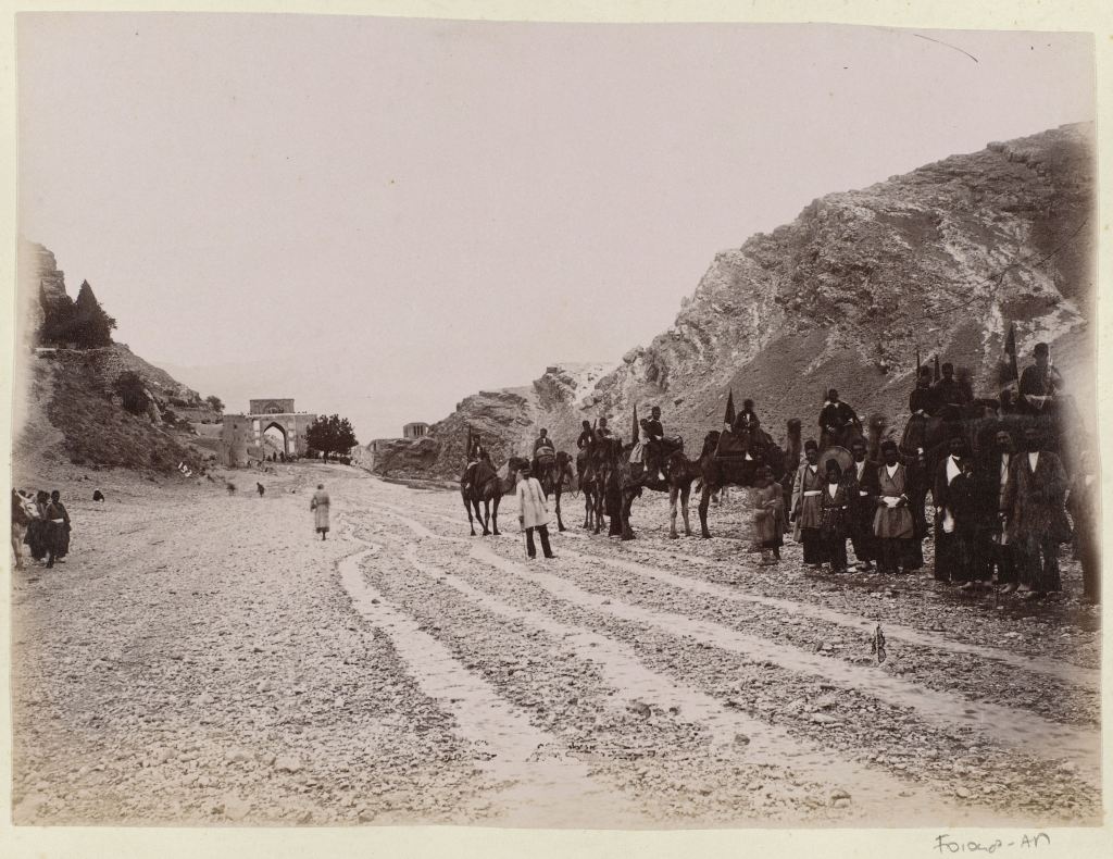 Ruitergezelschap verlaat Shiraz, op de achtergrond de Koranpoort, Antoine Sevruguin, ca. 1880 – ca. 1895