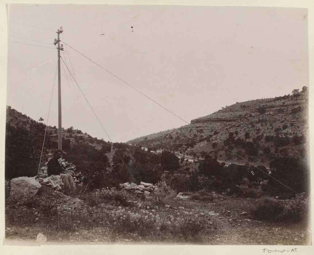Reiziger op een rots bij een telegraafpaal in een landschap in Perzië, Antoine Sevruguin, ca. 1880 – ca. 1895