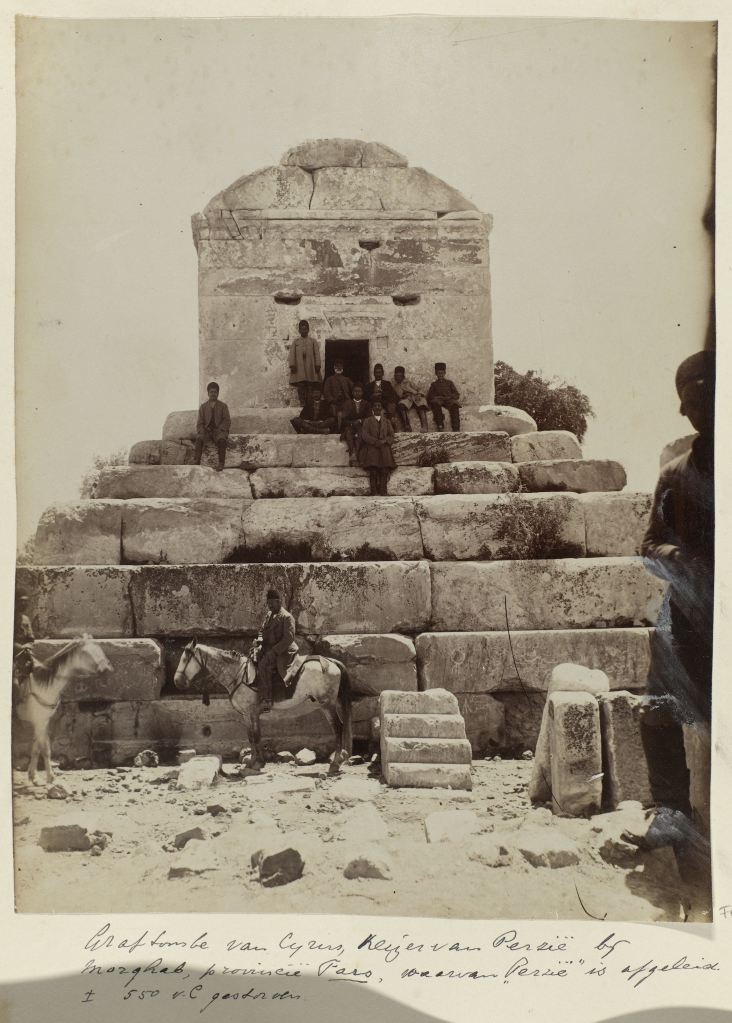 Gezelschap poserend op de graftombe van Cyrus II de Grote in Pasargadae, Antoine Sevruguin (toegeschreven aan), ca. 1880 – ca. 1895