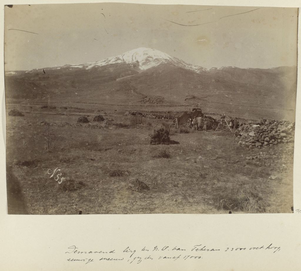Gezicht op de berg Demaoend in Perzië, met op de voorgrond mannen in de weer met een driepoot, Antoine Sevruguin, ca. 1880 – ca. 1895