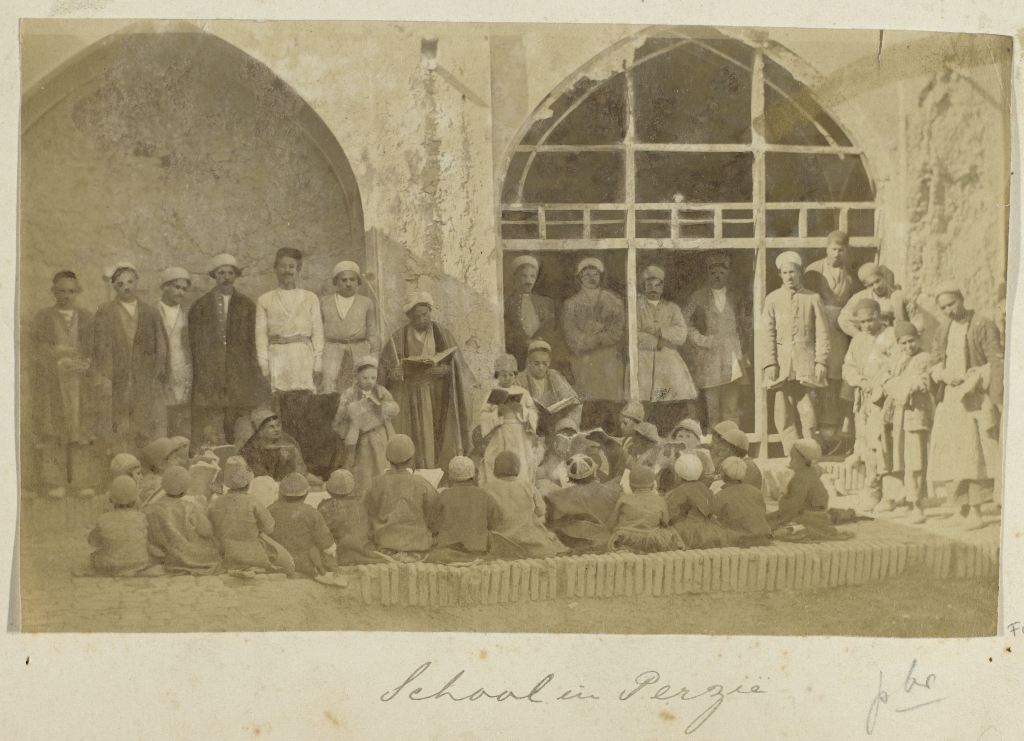 Lezende leerlingen en volwassenen op de binnenplaats van een school in Perzië, Antoine Sevruguin, ca. 1880 – ca. 1895
