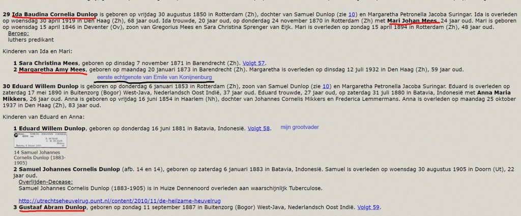 Zij kregen 12 kinderen. No 7 is Ida Baudina Cornelia Dunlop. Zij was de echtgenote van Mari Johan Mees en de moeder van Margaretha Amy Mees, de eerste vrouw van Emile van Konijnenburg.