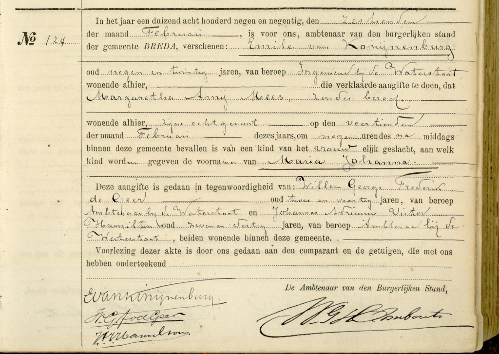Konijnenburg, Emile van (Den Haag 7 okt. 1869 – Den Haag 27 apr. 1956), ingenieur. Werkte, na in 1892 te zijn afgestudeerd als civiel ingenieur aan de Polytechnische School te Delft, in verschillende functies, afwisselend bij Rijkswaterstaat en in het Midden Oosten. Was van 1906 tot 1914 werkzaam bij de rivierverbetering van de Maas, tot 1918 bij werken in het Suezkanaal en de haven van Suez en tot 1930 als Hoofdingenieur-Directeur van Rijkswaterstaat, belast met de verbeteringswerken van de Maas. Ontwierp plannen voor de havens van Jaffa, Haifa, Beiroet en Tripoli. Schreef o.m. het driedelige standaardwerk ‘De Nederlandsche Scheepsbouw vanaf zijn oorsprong (1895-1905)’ en ‘Scheiding van Maas en Waal’; beschrijving van den vroegeren waterstaatkundigen toestand in Noordbrabant, alsmede van de werken uitgevoerd voor de verlegging van den Maasmond (1906)’. Was een verdienstelijk tekenaar en schilder van landschappen en dieren.
