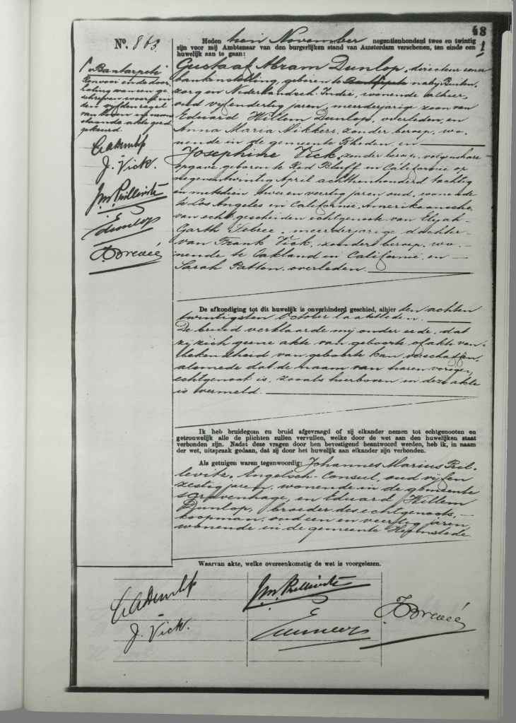 Josephine Vick trouwt in 1922 met Gustaaf Abram Dunlop. Josephine werd 1880 geboren in Red Bluff in California. Ten tijde van haar huwelijk met Bram was zij 42 jaar. Bram, geboren in 1887, was toen 35 jaar.