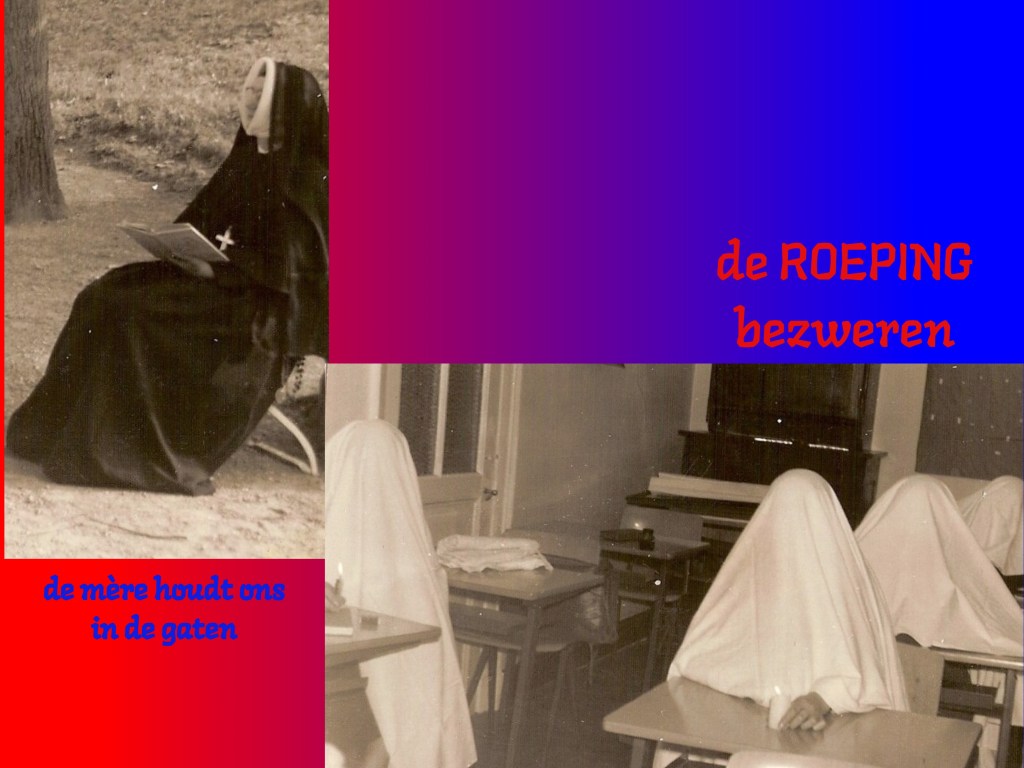 Er was echter één ding waar ik nogal bang voor was. In de verhalen over katholiek zijn kwam er één ding voor waar ik zeer bevreesd voor was. En dat was het feit dat het kennelijk zomaar zou kunnen gebeuren dat je als katholiek meisje opeens met een ROEPING te maken zou kunnen krijgen. Ik ben die drie jaren op de kostschool echt bang geweest dat ik ‘geroepen’ zou worden om verder als non door het leven te gaan. Ik had wel begrepen dat als je dat overkwam je dat als een voorrecht moest zien en daar geen nee op kon zeggen. Maar…..het leek mij verschrikkelijk en angstaanjagend om de rest van je leven als non door het leven zou moeten gaan. Ik was duizend maal liever leerling op de kostschool dan kloosternon die de scepter zwaaide over de leerlingen.