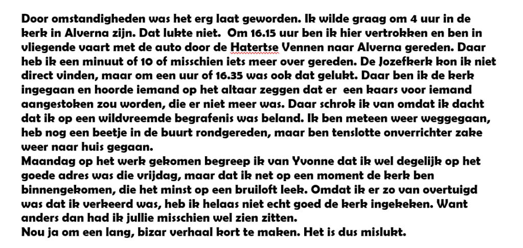 Maar wat bleek…. Ik ben op die huwelijksdag op weg gegaan naar Alverna, waar in de kerk de ceremonie plaats zou vinden. Ik kwam, iets te laat in de kerk aan en maakte na een hilarisch misverstand dat ik weer snel uit die kerk kwam.